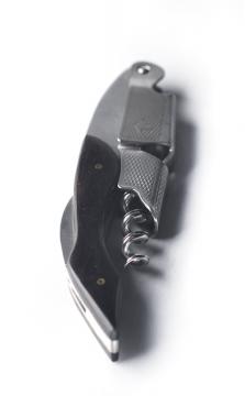 酒刀(waiter's friend):從英文直譯,這種開瓶器叫做“侍者之友”,國內通常叫侍者之刀。因為這種開瓶器上帶有一把用于切開封帽的折刀,而且很小巧,方便放到侍者的上衣口袋里,幾乎全世界餐廳的侍者都使用這種類型的開瓶器開酒。一件小巧的工具就可以完成切下封帽和打開木塞的工作,而且可以完成得很酷,很瀟灑。用它開酒時,先用鋸齒形折刀把封帽切下,將螺絲錐旋入木塞,借助旁邊的杠桿把木塞拉出。該酒刀的杠桿是兩節形,可以分兩次將木塞提起,螺絲鉆上涂有特弗隆涂層以減少摩擦。