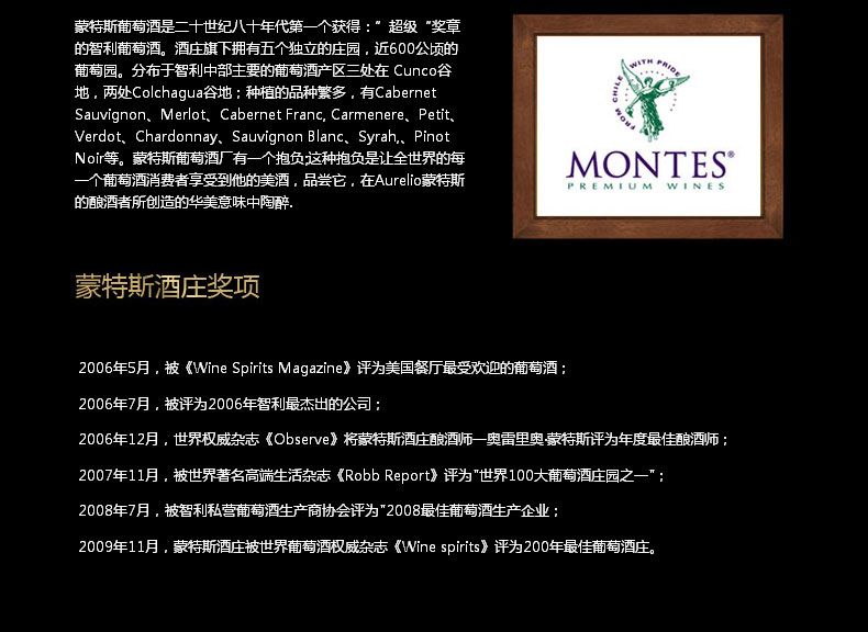 被世界葡萄酒權威雜志《wine & Spirits》評為美國頂級餐廳最受歡迎的智利葡萄酒,獲得90分好評。