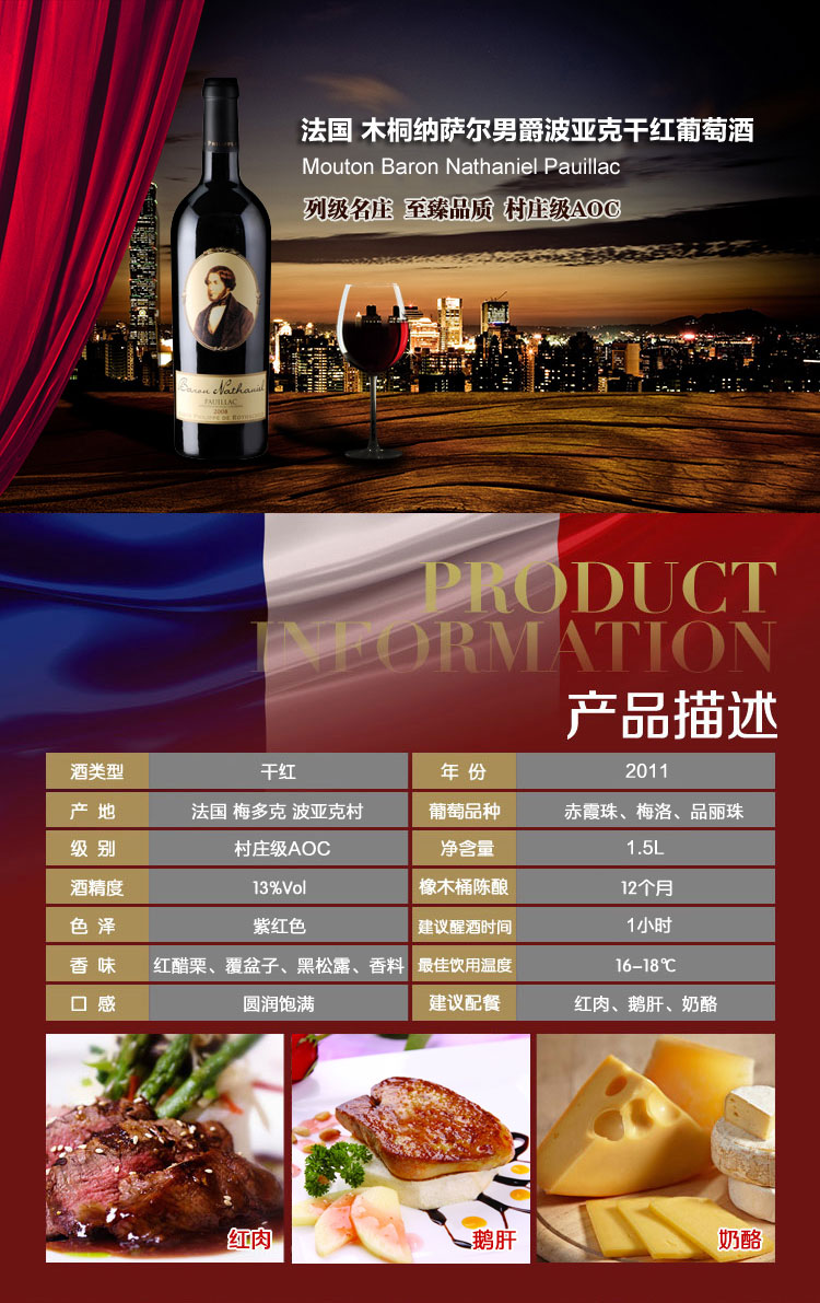 法國木桐納薩爾男爵波亞克干紅葡萄酒(又名:木桐天賜伯爵波亞克干紅葡萄酒)1.5L