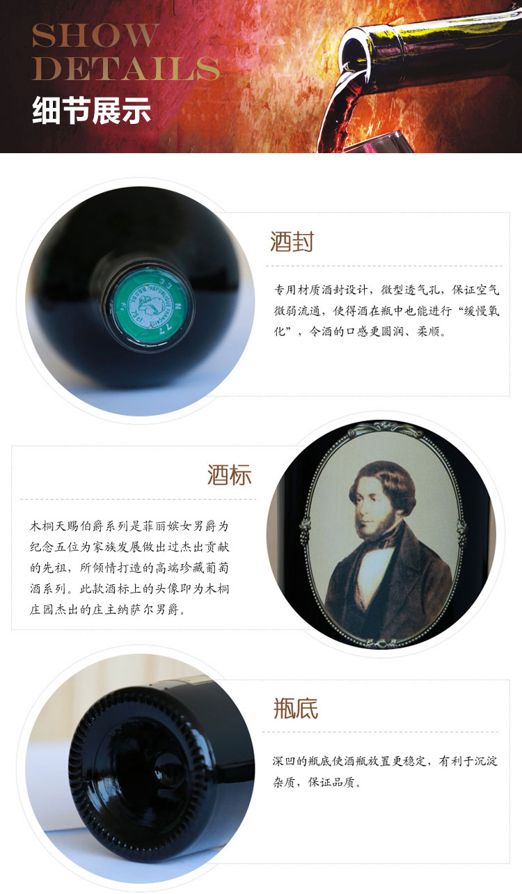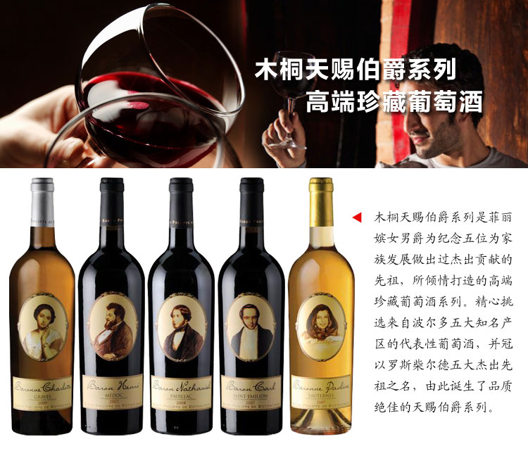 出自名莊名村的優(yōu)質葡萄酒。為紀念木桐莊園杰出的莊主納薩爾男爵而傾情打造的高端珍藏葡萄酒。波亞克村莊級AOC。