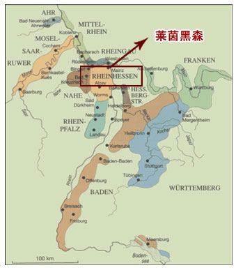 萊茵黑森地區(qū)(Rheinhessen)23%種植米勒(Mller Thurgau),13%種植西萬尼(Silvane)r,9%種植雷司令(Riesling),9%種植施埃博(Scheurebe),科訥(Kerner)和巴克斯(Bacchus)各占8%。內(nèi)有3個子產(chǎn)區(qū):Binern, Nierstein和Wonnegau,共有24個酒村,434個單一葡萄園,這里的人更注重質(zhì)量,而不是單純追求產(chǎn)量,直到今天,人們依然保持著這個可以追溯到古羅馬時代的傳統(tǒng)。 本地區(qū)氣候溫和,周圍都是山脈和森林,素有“萊茵黑森的‘瑞士’”之稱。這種群山環(huán)繞、森林密布的地理優(yōu)勢足可以使該產(chǎn)區(qū)的葡萄園免受寒風(fēng)的危害,為葡萄的完全成熟提供了良好的自然條件。這個產(chǎn)區(qū)主要的土壤類型有黃土、石灰石和壤土,常混雜有砂礫或沙子。