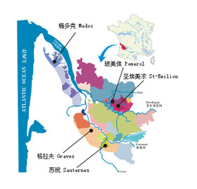 波爾多地區由多個小區組成,每個小區由于自然條件的差異,釀造出來的葡萄酒也千姿百態。總體來講,波爾多有五大主要產區,分別是:梅多克(Medoc),波美侯(Pomerol),圣埃美隆(St-Emilion),格拉夫(Graves),蘇玳 (Sauternes)。細數不同的產區,就如同探尋風格迥異的人的特質,精髓與道地都需要慢慢體味。
