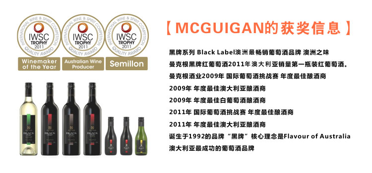 澳洲曼克根黑牌系列產于澳大利亞獵人谷或巴羅薩谷,由曼克根上市公司的現任主席Brian McGuigan親自釀制,采用澳洲典范葡萄品種釀造,有嚴謹的單寧和橡木味,酒體結構完美平衡,微酸。獲澳洲2005最佳莊園獎。來自澳洲第二大酒莊McGUIGAN,酒的質量好而且有保證。其南澳產區以產設拉子聞名,這里陽光充足、氣候優良且穩定,土地礦物質豐富,擁有不受污染的最佳天然環境,能種植出世界上最好的葡萄。曼克根干紅精選著名的紅葡萄品種設拉子釀造,果味香濃,柔和順滑,獲2003年酒類國際博覽會金獎。該酒莊是澳大利亞酒業中的佼佼者,專注于葡萄園管理和發展以及葡萄酒釀造,在澳大利亞酒業跨過五十年和四個世代。酒莊崇尚保留葡萄品種的最高度原味和果香的釀酒哲學,從而使葡萄酒充滿個性和活力,特別是其銳意創新、出類拔萃的釀酒技術,多元文化背景的釀酒經驗,使他成為紅酒新世界的優質葡萄酒生產商之一。