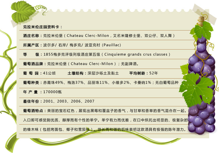 品鑒記錄: 克拉米倫只有正牌——Chateau Clerc Milon,陳年后單寧豐富而集中,層次感豐富,帶有濃厚的黑色水果的氣息。如果要說風格與Mouton(武當)正酒相像的酒,Chateau Clerc-Milon優勝于在1933年就加入Mouton家族的Chateau d’Armailhac。因在90年代中,Clerc-Milon釀成的酒多次拿了Parker九十分以上的評分。Clerc-Milon的風格比d’Armailhac細致,酒香亦足,新酒之時通常帶有咖啡木桶香氣,煞是吸引。雖然酒香來的有點粗糙,但與Mouton正酒有點相像。只要是蒙瓶試酒,很容易令人有Clerc-Milon更像Mouton的副牌的感覺,Le Petit de Mouton反而不像。Clerc-Milon與d’Armailhac一樣,踏入1996年以后酒質突飛猛進,是非常高物值的選擇。