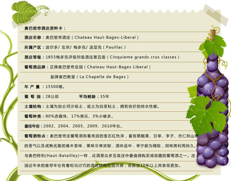 與奧巴特利(Haut-Batailley)一樣,奧巴里奇莊是眾多五級(jí)莊中最值得購(gòu)買或收藏的葡萄酒之一。酒莊近年來(lái)的推薦年份有著相當(dāng)討巧的酒體結(jié)構(gòu)和層次感,若陳放10年以上表現(xiàn)則更加。