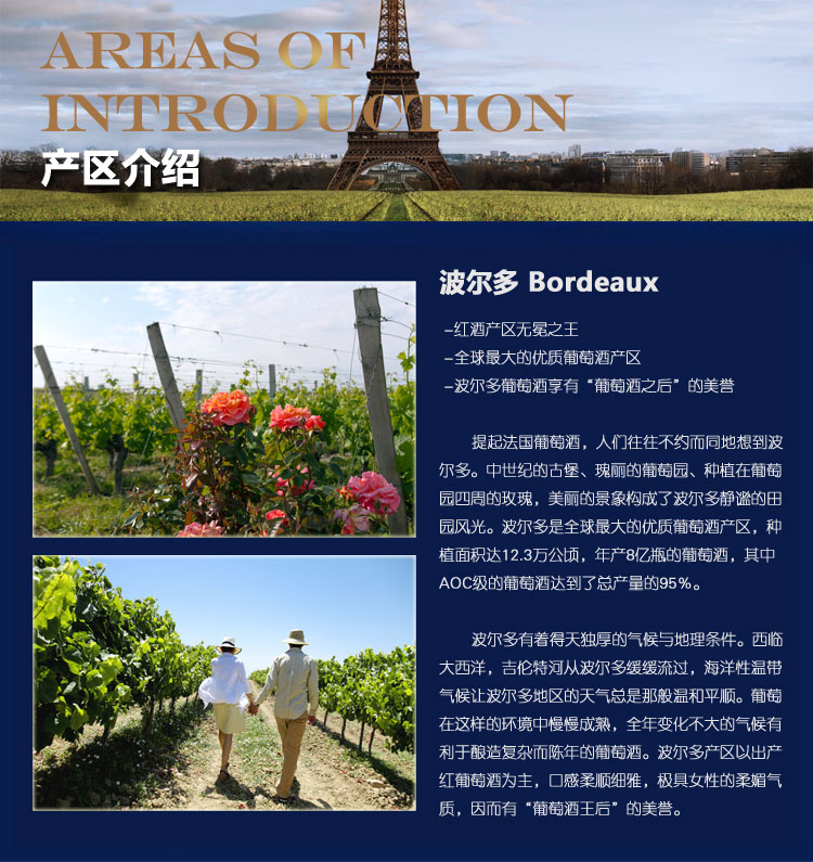 提起法國葡萄酒,人們往往不約而同地想到波爾多。中世紀的古堡、瑰麗的葡萄園、種植在葡萄園四周的玫瑰,美麗的景象構成了波爾多靜謐的田園風光。波爾多產區是全球最大的優質葡萄酒產區,種植面積達12.3萬公頃,年產8億瓶的葡萄酒,其中AOC級的葡萄酒達到了總產量的95%。
