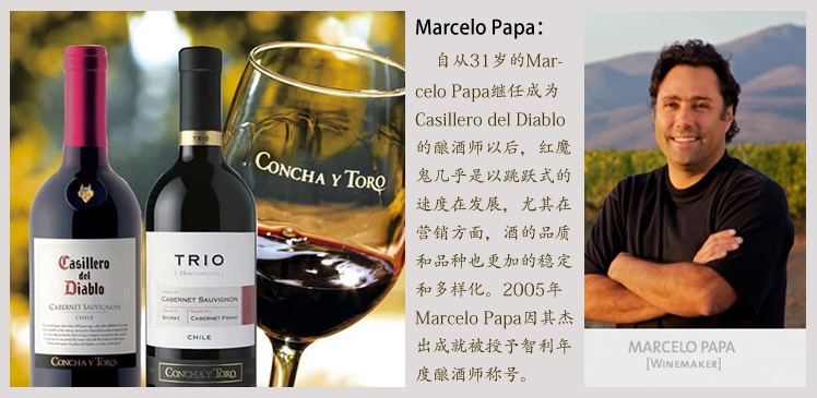 自從31歲的Marcelo Papa繼任成為Casillero del Diablo的釀酒師以后,紅魔鬼幾乎是以跳躍式的速度在發(fā)展,尤其在營銷方面,酒的品質(zhì)和品種,也更加的穩(wěn)定和多樣化。