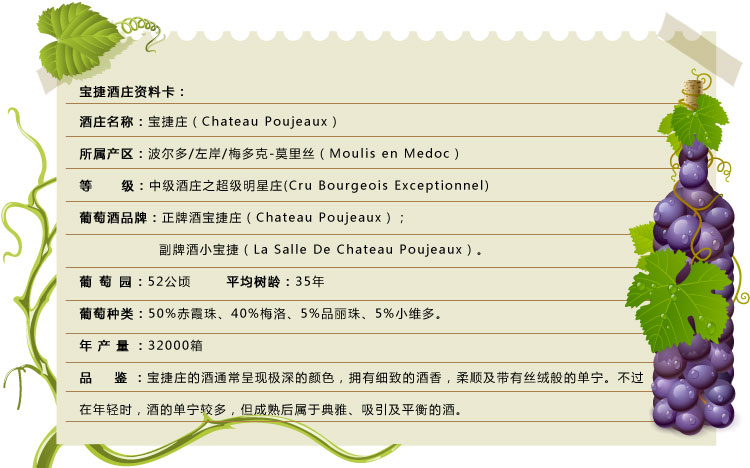 寶捷莊(Chateau Poujeaux)位于波爾多左岸梅多克產區的莫里絲(Moulis)產區,被評為247個波爾多明星酒莊中的最高等級“超級明星莊”,獲此殊榮的酒莊僅有6個。歷史上,法國前總統蓬皮杜在其私人會所款待羅斯柴爾德伯爵,用的是沒有酒標的1953年紅酒。這位拉菲的擁有者以為是自己的酒,事后才知其實是寶捷莊的。這段軼事足以說明寶捷莊的優質。