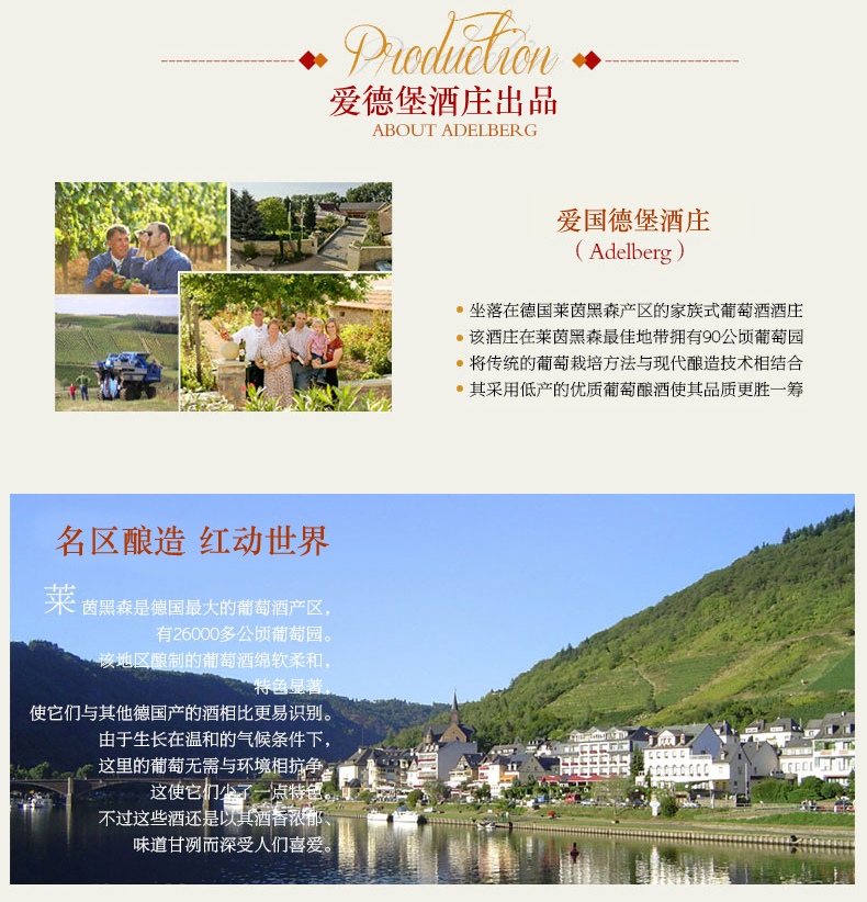 德國萊茵黑森的小鎮(zhèn)芙蓉瀚 (Flonheim)里有個美麗而古老的磨坊,1990年史都茲(Stütz)家族買下后把磨坊改建成一座現(xiàn)代化釀酒廠,這便是愛德堡酒莊(Adelberg Weinkellerei)。這是一座由父子兩代人共同經(jīng)營的家族式葡萄酒莊,在芙蓉瀚鎮(zhèn)最佳地帶擁有75公頃葡萄園,酒莊將傳統(tǒng)的葡萄栽培方法與現(xiàn)代釀造技術(shù)相結(jié)合,目標是產(chǎn)出優(yōu)質(zhì)、價位合理且深具產(chǎn)區(qū)特色的優(yōu)質(zhì)葡萄酒。酒莊以傳統(tǒng)葡萄品種(雷司令及黑皮諾)為主,搭配國際流行葡萄品種釀造及銷售,銷售網(wǎng)點遍布德國全境,而且在歐洲其他10個國家也有銷售點,產(chǎn)品行銷世界150多個國家。目前,酒莊將銷售重點轉(zhuǎn)向亞洲市場,無疑未來中國將是其最大的銷售市場之一。